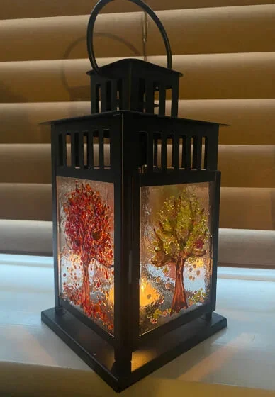 Fused glass autumn lantern with Sue